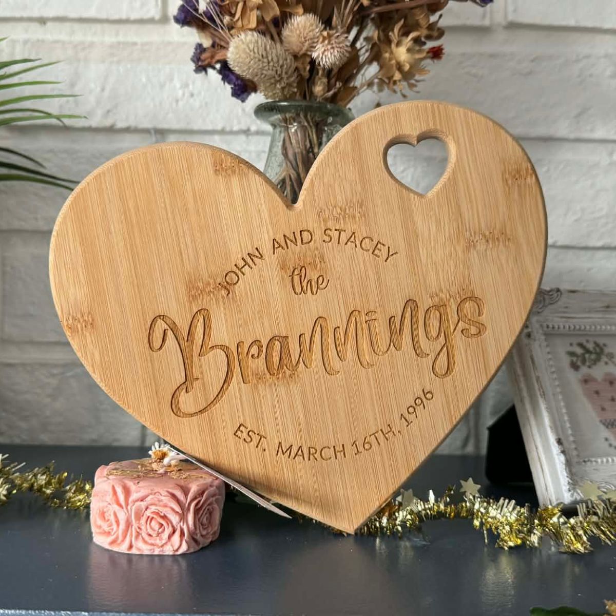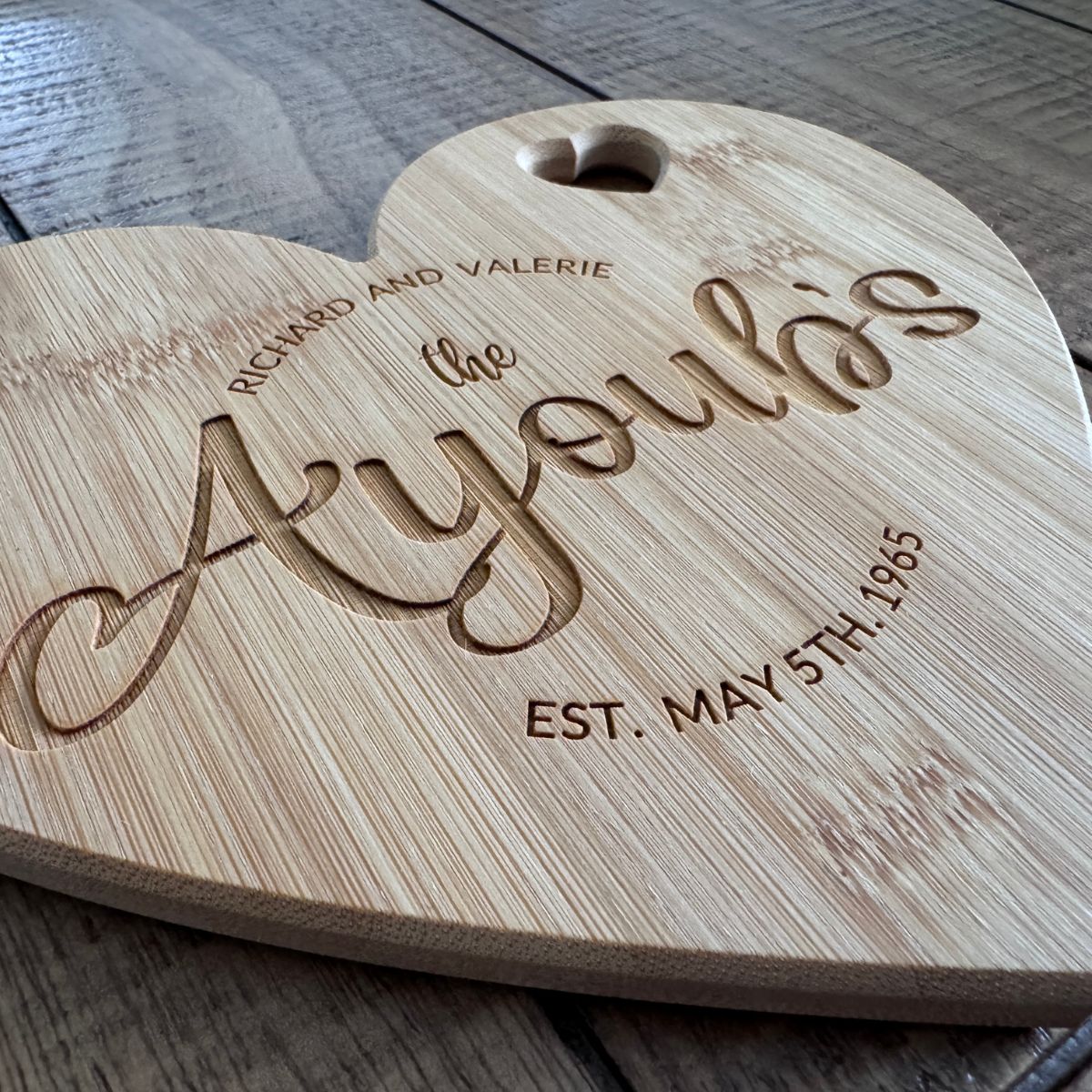 Custom engraving turns this heart shaped board into a lasting keepsake. Add names, a special date, a meaningful phrase, or a logo to create a piece that celebrates love, connection, and shared moments.